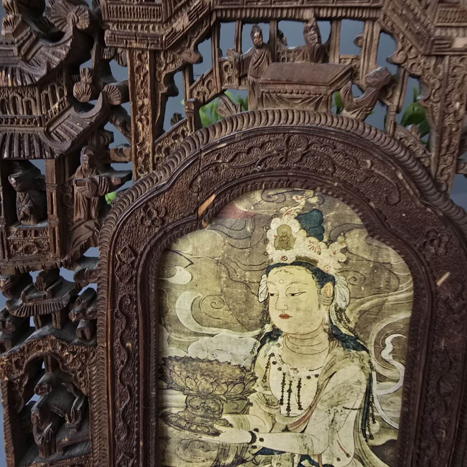 Aufwendig gearbeitete Schnitzereien mit figürlichen und architektonischen Motiven, detailreich und typisch für asiatische Kunsthandwerke.