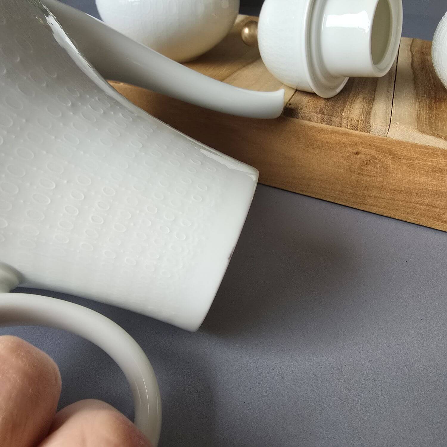Farbe: Weiß. Zustand: gut; kleiner Glasurfehler am oberen Rand der Kanne, im Gebrauch durch den aufgesetzten Deckel nicht sichtbar (siehe Fotos).