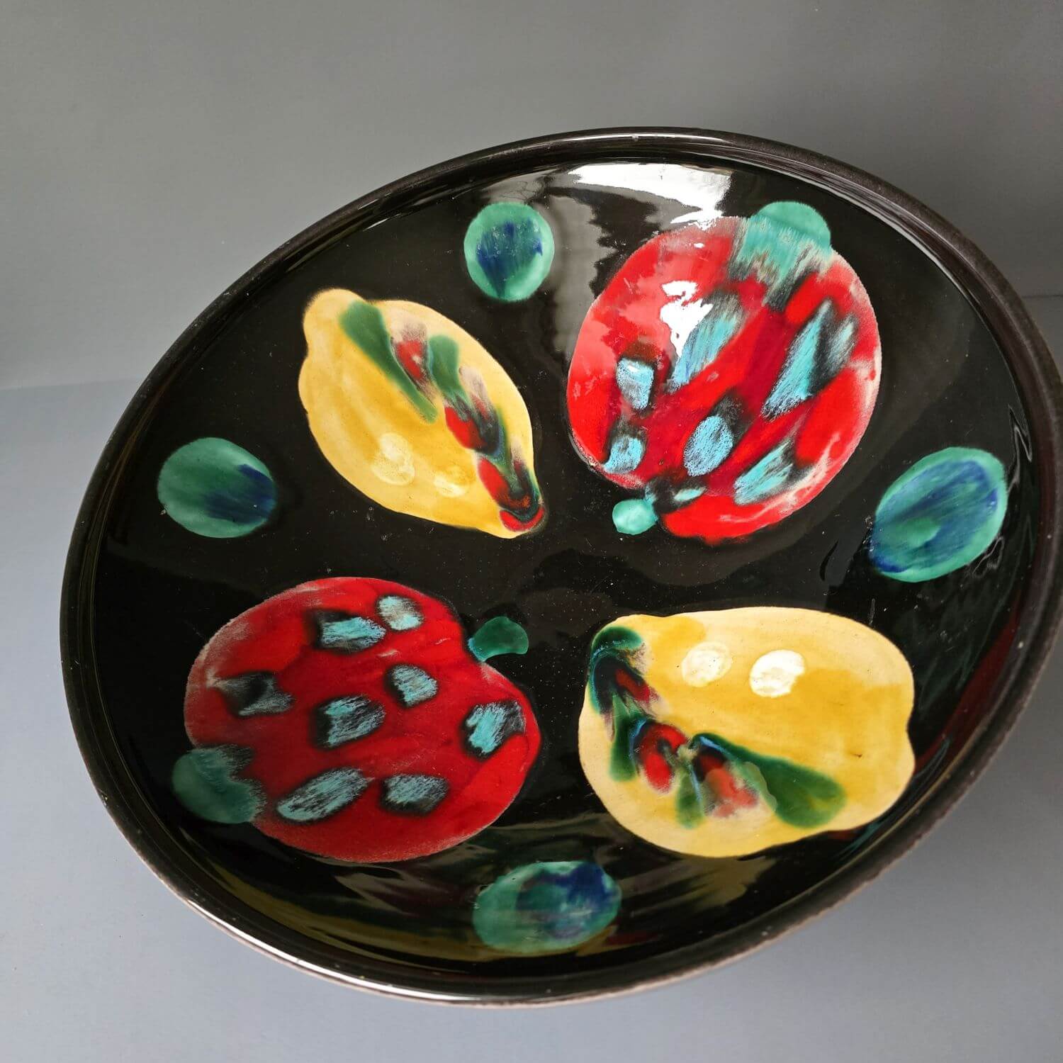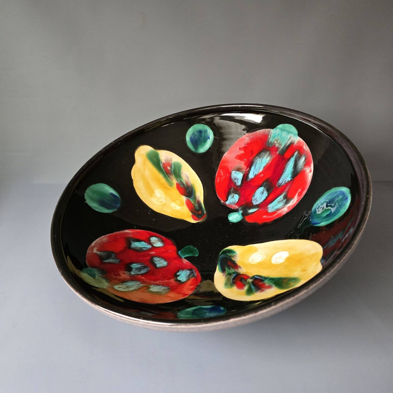 Farbe: innen schwarz mit Obst Motiv in rot, gelb grün Tönen, außen grau-beige